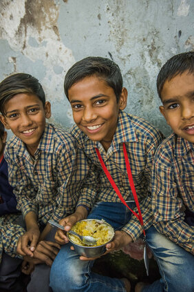 Die milliardste Mahlzeit – Gemüsecurry mit Reis – erhielt der 12-jährige Mohsin in der Sangam-Vihar-Schule in Noida, Indien. Mohsin und seine Klassenkameraden feierten dieses unglaubliche Ereignis mit Tänzen und Gesängen.