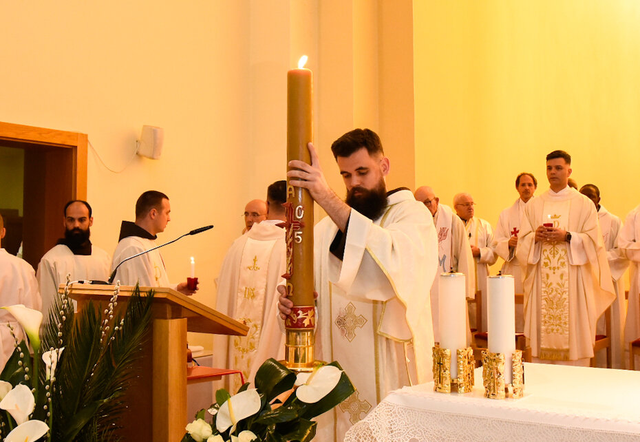 Zu Beginn seiner beiden Predigt betonte P. Jure Barišić, dass die Feier an diesem Abend etwas ganz Besonderes sei: „Wir feiern den Übergang von der Dunkelheit zum Licht, von der Stille zur Stille und zum Gesang – den Übergang vom Tod zum Leben.“