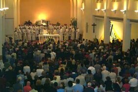 Wegen der großen Zahl von Gläubigen wurde die Kirche zu klein, sodass die ganze Osternachtsfeier auf Videowand im gelben Saal und im Freien rund um die Kirche mitfeiern konnte.